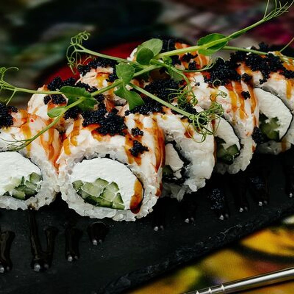 Креветка тигровая, икра черная тобико, сыр сливочный, соус унаги, нори, рис высшего сорта