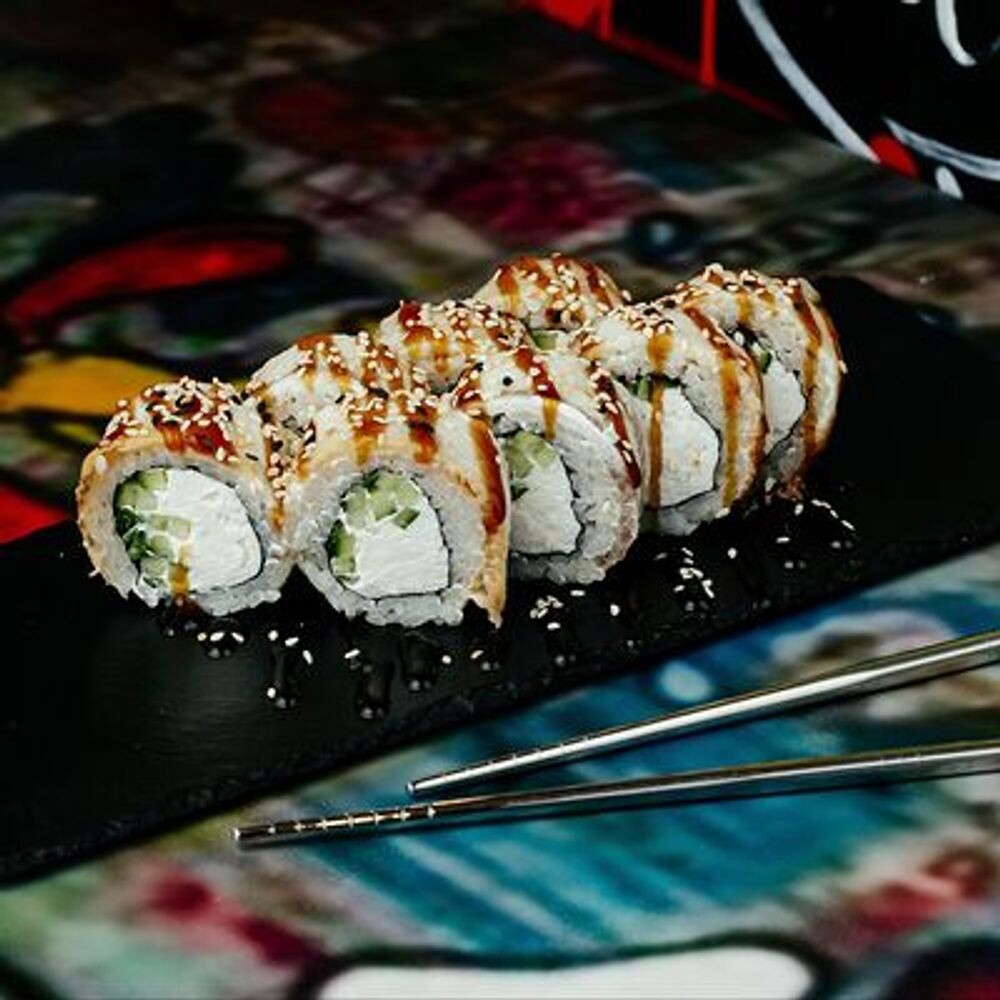 Угорь, огурец, сыр творожный, нори, рис высшего сорта