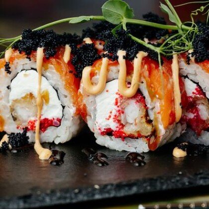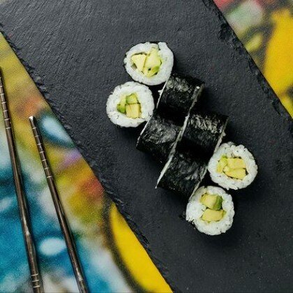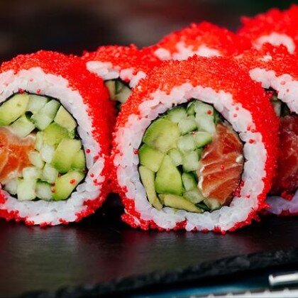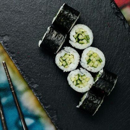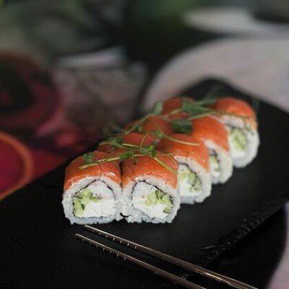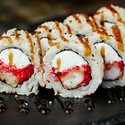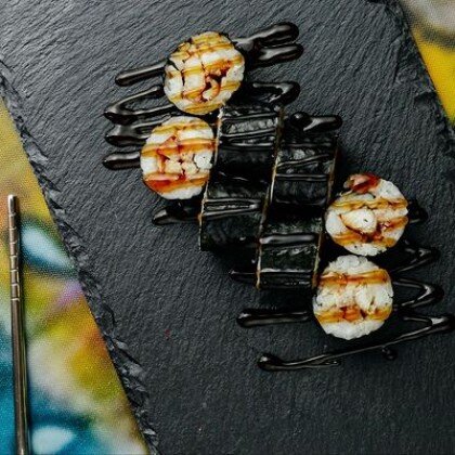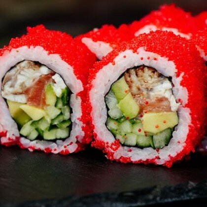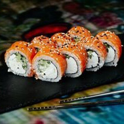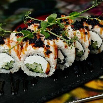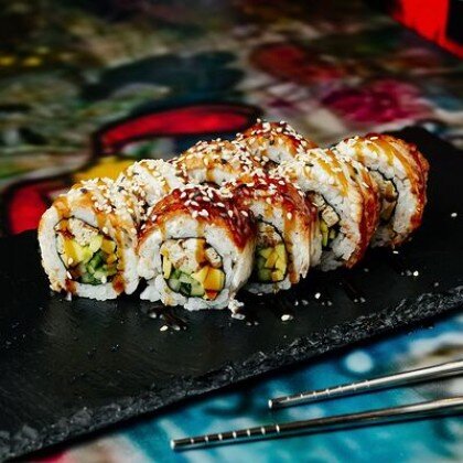 Шинкованный угорь в соусе, японский омлет, огурец, унаги, кунжут, сыр высший сорт, нори