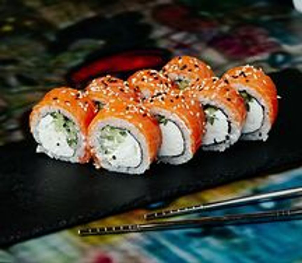 Лосось, огурец, сыр творожный, рис высшего сорта, нори, имбирь, васаби, соевый соус