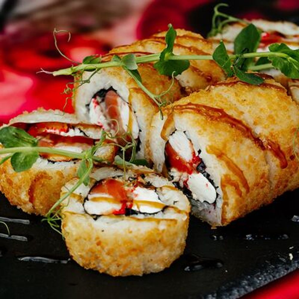 Угорь, лосось, креветка, сыр творожный, икра тобико, рис высшего сорта, нори