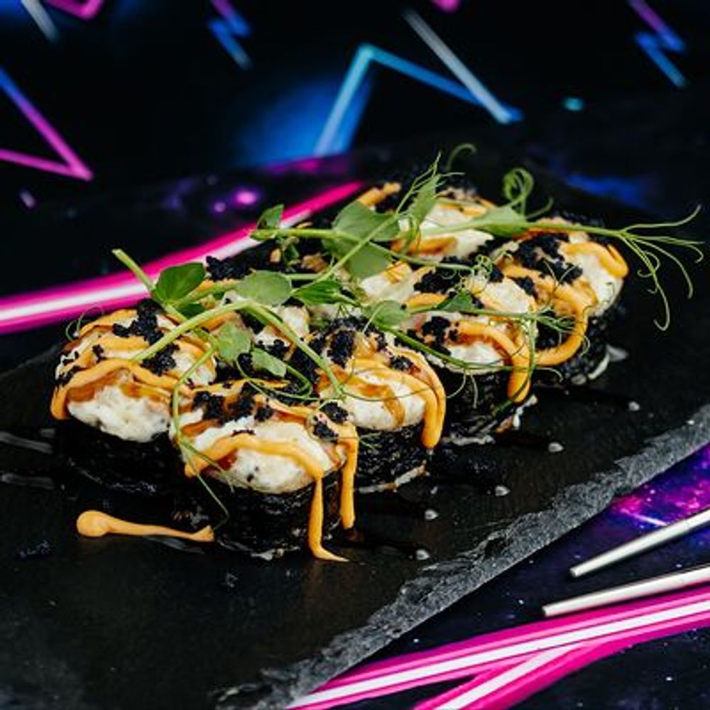 Рубленая тигровая креветка,, креветка внутри, сыр творожный, огурец, спайси-соус, тобико, рис высшего сорта, нори