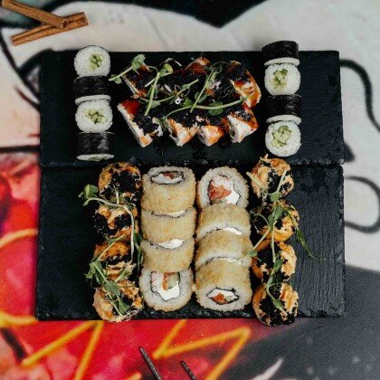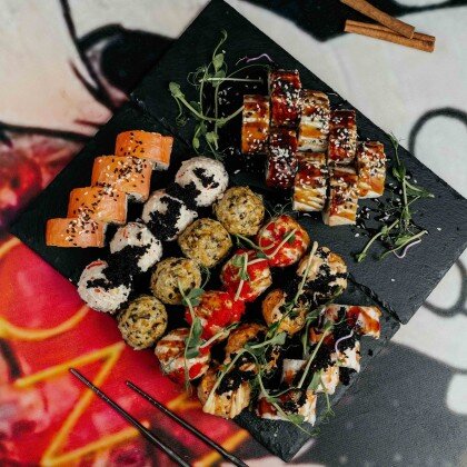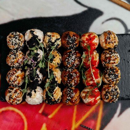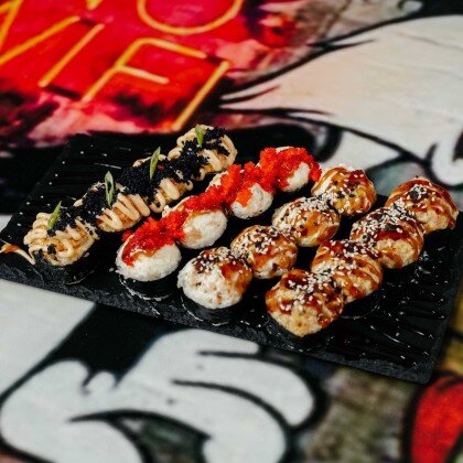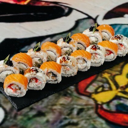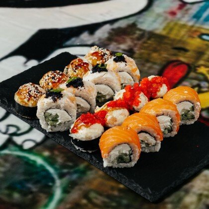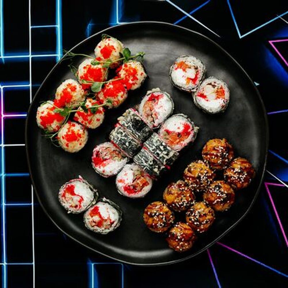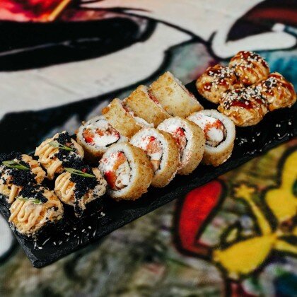 Калифорния яки, запечённый ролл с угрем, ролл темпура с лососем, ролл темпура с морепродуктами (1/2 порции)