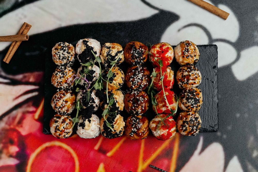 Запечённый ролл с лососем и сыром, Запечённый ролл том ям и лососем внутри (1/2 порции), Запечённый ролл Калифорния яки с лососем внутри (1/2 порции), Запечённый с угрем и тигровой креветкой внутри (1/2 порции), Запечённый с креветкой спайси и тигровой креветкой внутри (1/2 порции)