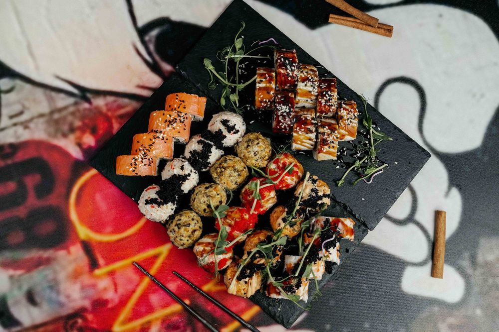 Филадельфия угорь лайт с омлетом и креветкой в темпуре, Филадельфия с лососем (1/2 порции), Филадельфия с креветкой (1/2 порции), Запечённый ролл том ям с лососем внутри (1/2 порции), Запечённый ролл Калифорния Яки с лососем внутри (1/2 порции), Запечённый с мидиями (1/2 порции), Запечённый краб (1/2 порции)