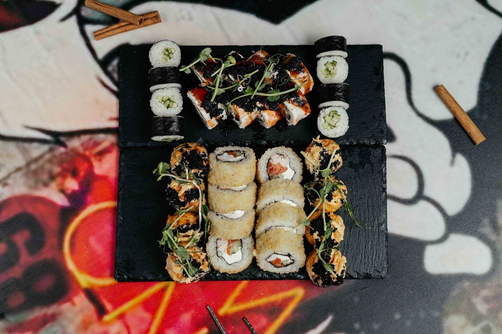 Запечённый ролл Том ям и с лососем внутри, Филадельфия с креветкой лайт с японским омлетом и лососем внутри, Темпура с лососем и тигровой креветкой, ролл с огурцом