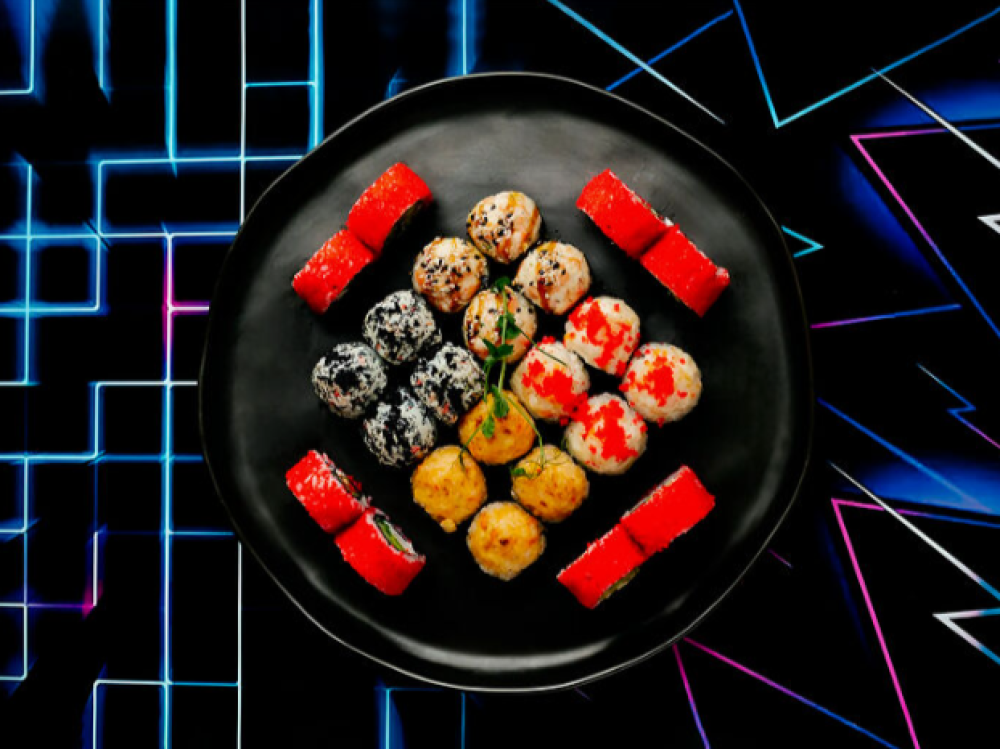 Калифорния с лососем, ролл запечённый с лососем 1/2,ролл запечённый с креветкой 1/2,ролл запечённый том ям 1/2,ролл запечённый снежный краб 1/2