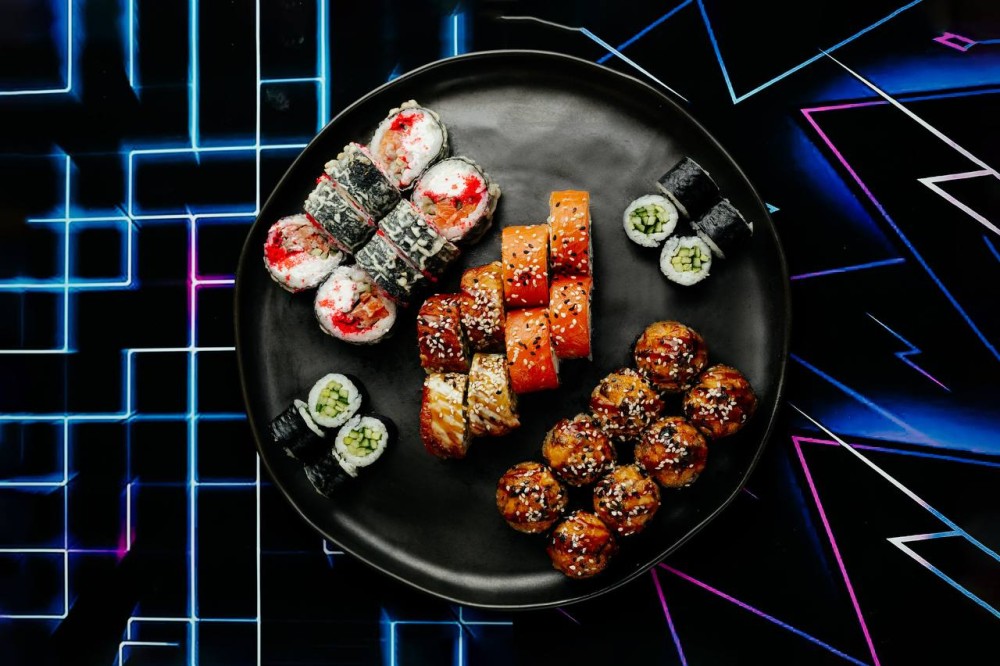 Филадельфия с лососем (1/2 порции), Филадельфия с угрем (1/2 порции), запечённый с угрем, темпура с лососем, ролл с огурцом